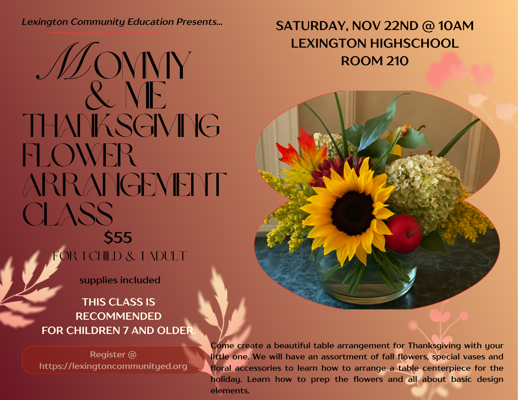 Lexington High School Field House - 251 Waltham St., Lexington, MA 02421 251 Waltham St., Lexington, MA 02421, LEXINGTON, M, United StatesCome create a beautiful table arrangement for Thanksgiving with your little one. We will have an assortment of fall flowers, special vases and floral accessories to learn how to arrange a table centerpiece for the holiday. Learn how to prep the flowers and all about basic design elements. Tuition is for one child and one […]